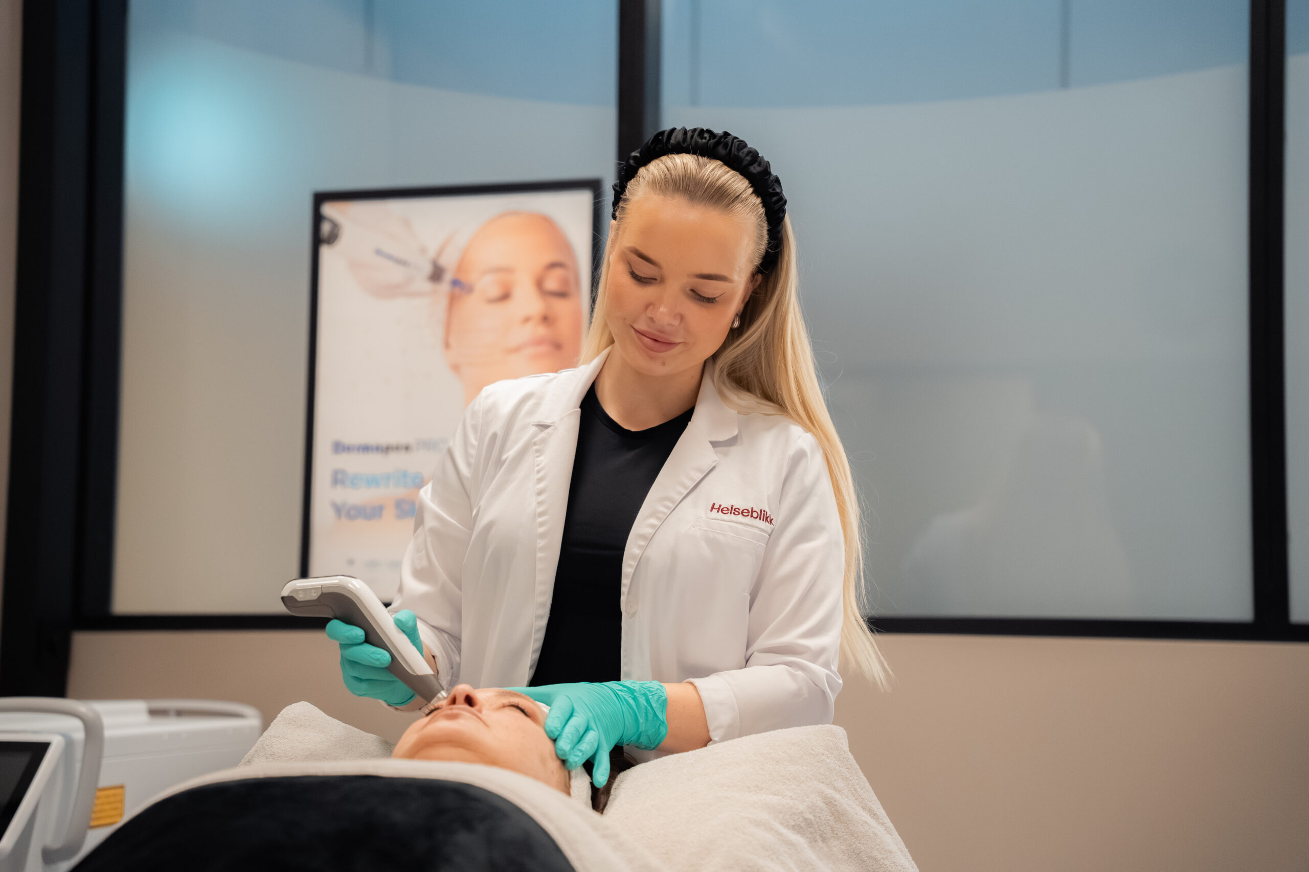 Dermapen er en avansert form for microneedling hvor vi lager kontrollert skade i huden ved hjelp av mange små stikk. Dette fører til at huden aktiverer en reperasjonsmekanisme, som stimulerer til økt produksjon av kollagen og elastin. Her kan vi jobbe med både glød/fukt, porer eller mer aktivt for pigmenteringer/ujevn hudtonre, rosacea, akne, rynker, oppstramming og aknearr/arr. Behandlingen kan brukes på alle typer hud og hudtoner, så lenge huden er hel og frisk.